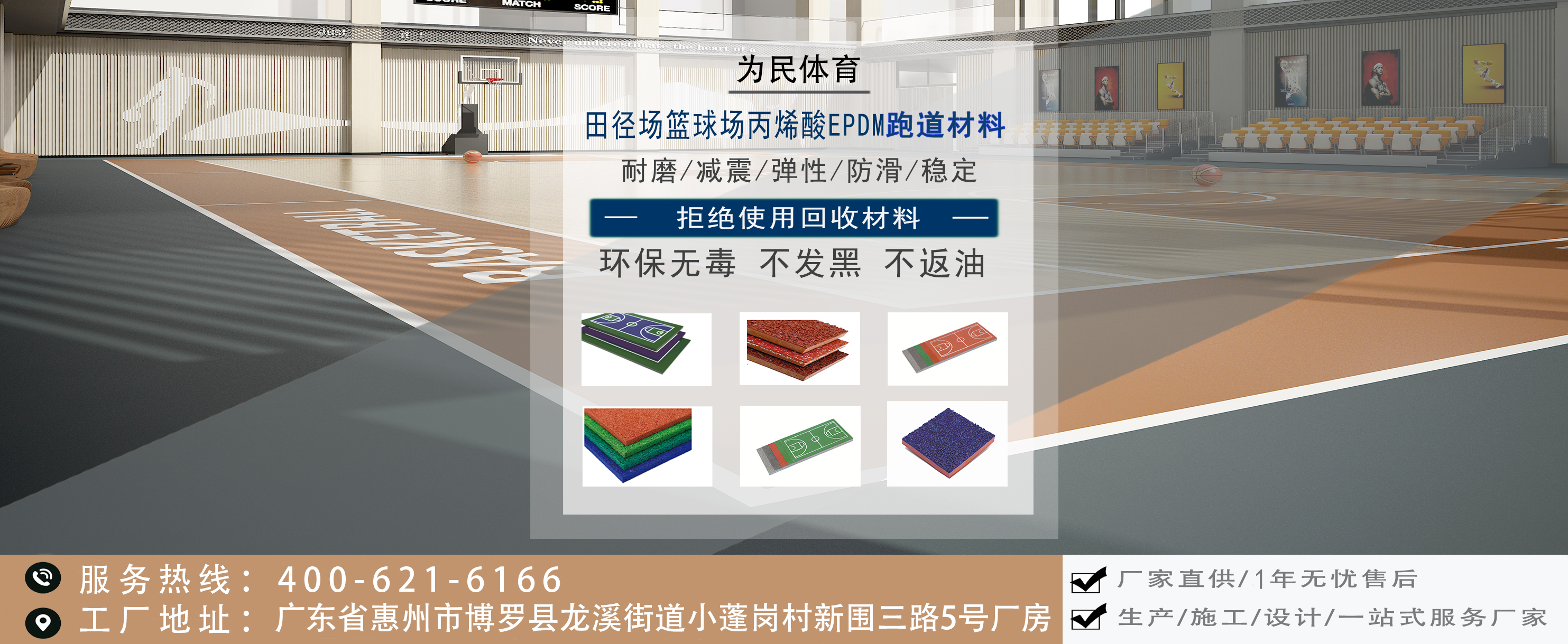 廣東為民體育產業有限公司是一家專業致力于塑膠跑道、納米硅PU球場、水性丙烯酸材料的生產、服務于一體的系統集成制造商。為民體育始創于2012年,始創團隊擁有15年的體育地面材料生產、研發、施工、營銷經驗,一直以來,堅持“質量為本,效率為先”的經營理念,以“我的目標就是讓您滿意”的服務理念,制造出高標準、高質量的產品,提供高效、無憂的產品售后服務。目前為民體育已提供超過100萬平方米的塑膠跑道、硅PU球場、丙烯酸體育地面材料,得到市場的廣泛認可。 廣東為民體育產業有限公司生產基地位于廣東省惠州市博羅縣園洲鎮廖尾村華潤工業區,工廠占地面積超過10000平方米,塑膠跑道、硅PU球場、丙烯酸材料年產量達到100000噸以上。 面向未來,為民人將以“全力以赴”的姿態迎接新時代的體育行業挑戰與機遇,讓運動更安全、讓運動更健康!